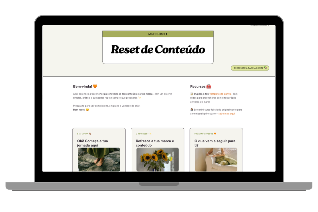 O mini-curso para te ajudar a voltar a criar com clareza, foco e leveza - ideal para ti que queres recomeçar ou refrescar a comunicação do teu negócio